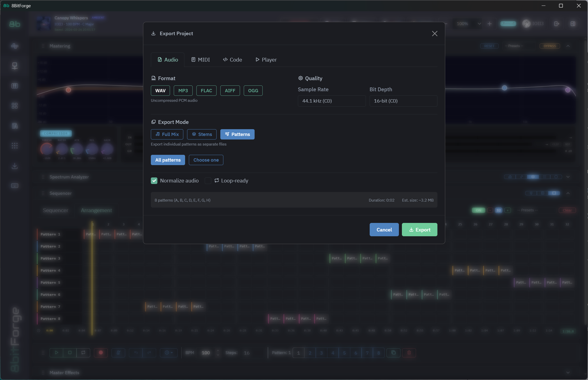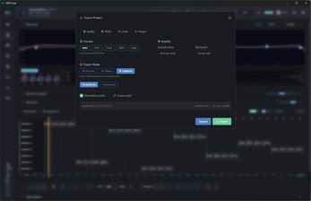 Export in WAV, MP3, FLAC, OGG, AIFF or MIDI. Up to 96kHz / 32-bit. Full mix or individual stems — game-ready out of the box.